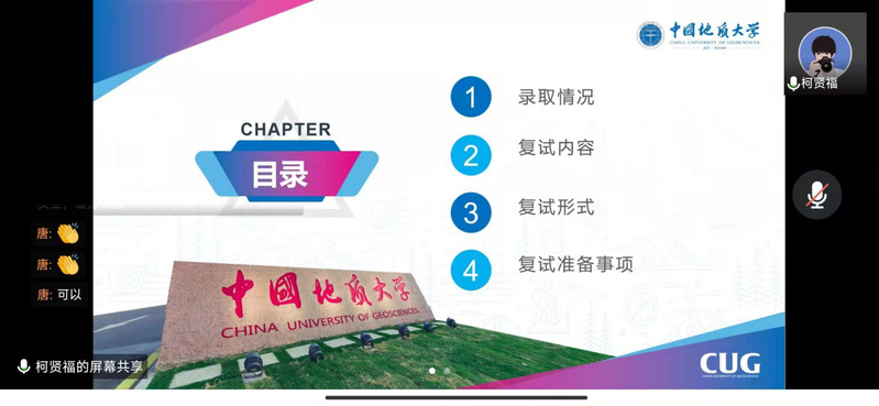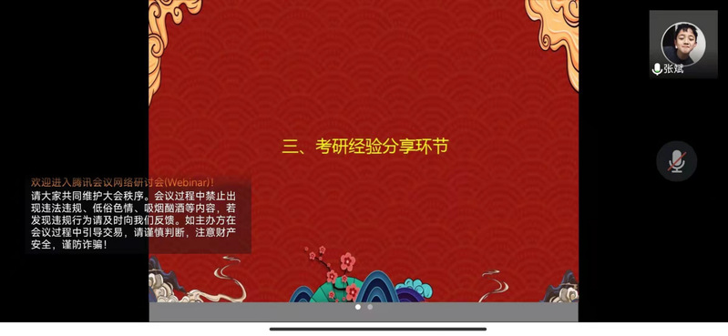 交流会伊始,黄新望代表学院致欢迎词,欢迎各位校友在春暖花开之际通过云端相聚,为我院研究生复试备考出谋划策。紧接着,黄新望就我院考研学生情况和过线人数进行通报,就疫情防控背景下的研究生复试进行分析。随后五位校友依次分享了复试备考经验,张斌介绍了面试环节熟悉毕业设计的重要性;柯贤福详细地讲解了线上复试中应该注意的问题和需要准备的事项;夏远庚结合自身复试过程中获得的教训进行分享;胡亚倩围绕专业课复试的重难点进行深入浅出的分析讲解;李良广就线下面试中的心态调整和注意事项作交流。最后大家围绕复试环节的具体问题进行了交流,黄新望提醒学院同学抓住疫情带来的机遇,迎接挑战,并祝愿大家在即将到来的复试中取得佳绩。