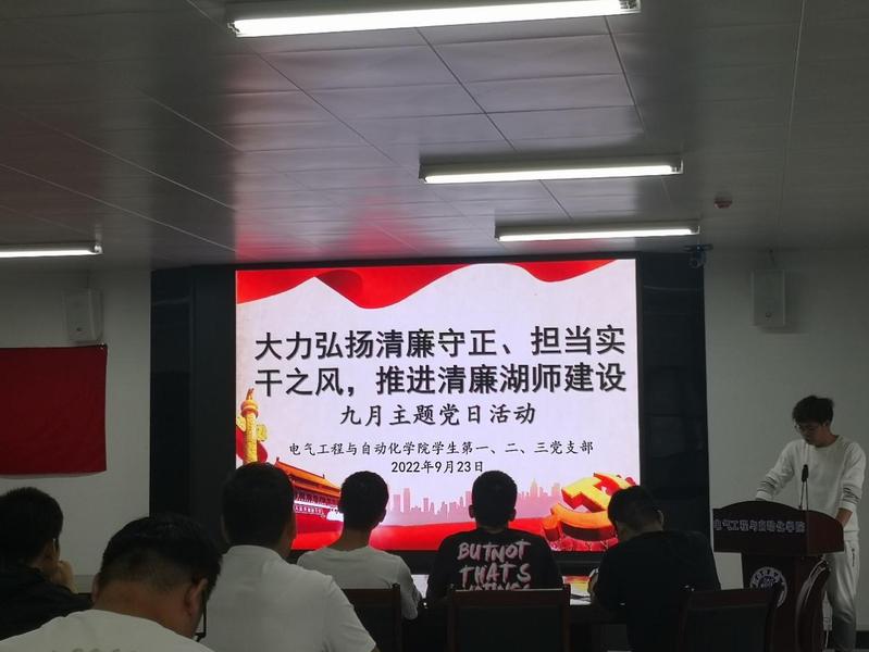 为深入学习贯彻习近平新时代中国特色社会主义思想,推进党建引领学校发展,着力促进基层党建工作提质增效。2022年9月23日16时,电气工程与自动化学院三个学生党支部在大数据与自动化实训中心会议室开展了以“大力弘扬清廉守正、担当实干之风、推进清廉湖师建设”为主题的党日活动,全体学生党员推进了此次活动。