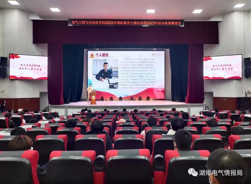 为了增强大学生国防安全意识,鼓励大学生积极参军入伍。2022年11月7日下午,电气工程与自动化学院在湖师大礼堂组织召开2022年国防教育主题宣讲暨2023年征兵政策解读会,参与此次会议的有辅导员黄新望,优秀退役士兵杨一群、李飞,学院毕业生代表、22级各班学生。