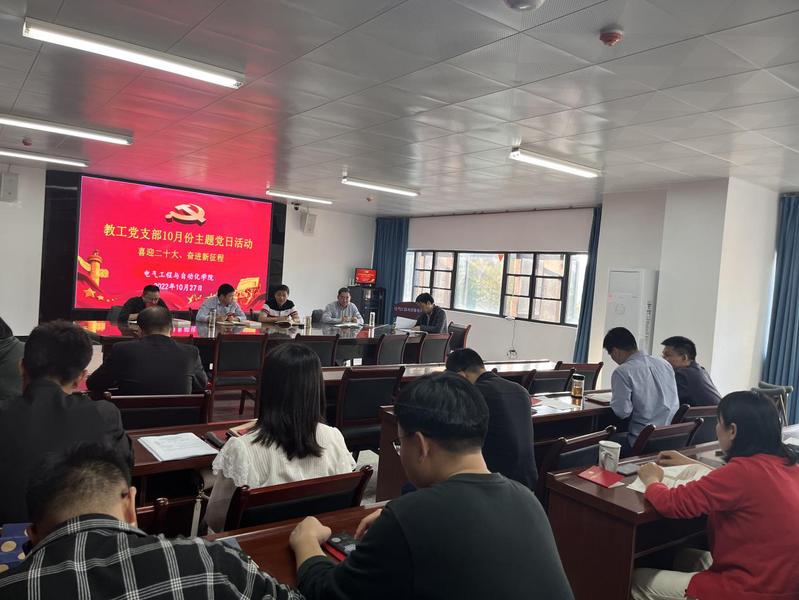 为深入学习贯彻习近平新时代中国特色社会主义思想,10月27日,电气学院教工党支部在24341会议室开展10月主题党日活动,本月党会活动主题为“喜迎二十大、奋进新征程”。党支部书记杨青胜同志主持,全体教工党员参会。