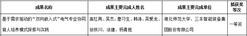 近日,从湖北省人力资源和社会保障厅和湖北省教育厅获悉,由湖北师范大学电气工程与自动化学院高红亮副教授主持的《基于需求驱动的“双向嵌入式”电气专业协同育人培养模式探索与实践》项目荣获第九届湖北省高等学校教学成果一等奖。