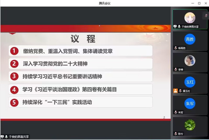 活动依次完成了线上交纳党费、重温入党誓词和诵读党章。党总支书记杨青胜同志领学《党的二十大报告辅导读本》,带领全体党员同志进一步学习与领会党的二十大精神;朱军同志领学《深入学习2022121<求是>杂志刊文<习近平:在党的十九届七中全会第二次全体会议上的讲话>》;李维同志领学《学习习近平总书记在亚太经合组织第二十九次领导人非正式会议上的讲话》;于俊同志领学《学习1110日中共中央政治局常务委员会会议上习近平总书记关于新冠肺炎疫情防控工作的重要指示精神》。全体党员同志集体学习《习近平谈治国理政》第四卷第五部分“统筹疫情防控和经济社会发展”。教工党员代表艾青、江波两位同志围绕本月活动学习内容,结合自身岗位职责与工作实际谈认识、说体会、讲打算。