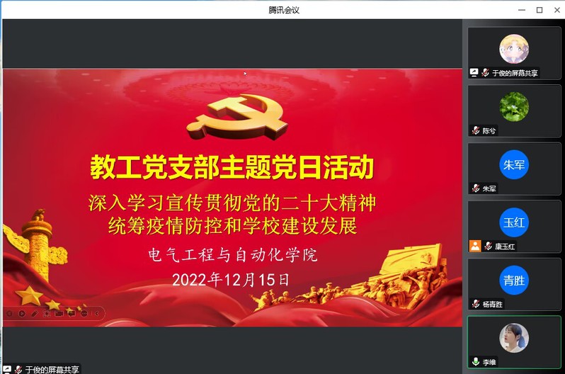 为深入学习贯彻党的二十大精神,团结带领全校广大党员干部群众精准高效打赢常态化疫情防控攻坚战,1215日下午,电气学院教工党支部在腾讯会议开展线上主题党日活动,本月活动主题为“深入学习宣传贯彻党的二十大精神,统筹疫情防控和学校建设发展”,党支部书记杨青胜同志主持会议,全体教工党员参会。