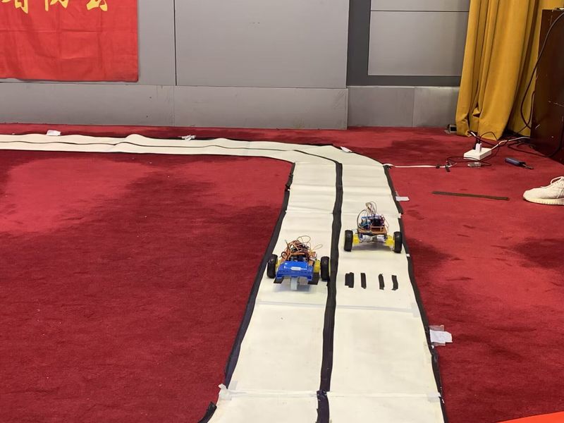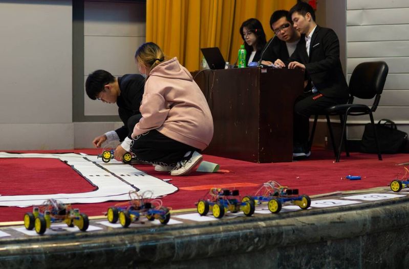 紧接着由裁判员代表介绍规则与赛制,本次比赛分为两组:蓝牙组与循迹组。其中蓝牙组采取BO1(一局定胜负),竞速胜者晋级的赛制,而在半决赛与决赛时,采取BO3(三局两胜)的赛制;循迹组比赛采取跑完规定赛道计时的赛制,用时越短成绩越好。蓝牙组和循迹组比赛场面一度显得焦灼和激烈,也引的台下观众惊叹连连。比赛完后,徐丰代表电气工程与自动化学院智能车创新实践基地对台下意犹未尽的同学们发出了参加全国科普创新智能车大赛的邀请。