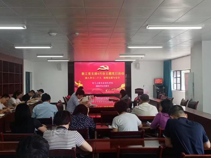 4月20日下午,电气工程与自动化学院教工党支部在24341会议室,围绕“深入学习二十大,统筹发展与安全”开展了4月份主题党日活动。活动由支部书记杨青胜同志主持,支部教工党员和入党积极分子参加活动。