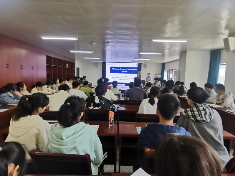 讲座中,胡文峰副教授首先介绍了多智能体系统协调控制的研究背景;随后,胡教授重点阐述了重置控制策略,提出了一种新颖的基于重置的双积分器多智能体系统一致性控制协议,通过开发的新型重置控制策略,解决了一般线性多智能体系统的领导者-跟随者一致性控制问题;紧接着,胡教授通过发展基于时变系统的稳定性分析方法,讲述了适用于切换拓扑的多智能体系统的重置控制策略;最后,师生互动,胡教授为研究生答疑解惑。