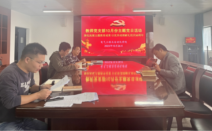 10月26日下午,电气工程与自动化学院教师党支部在24341会议室开展10月份主题党日活动,活动主题为“深化拓展主题教育成果 以优异成绩献礼校庆50周年”。活动由支部书记陈兮同志主持,学院全体教师党员和入党积极分子参加活动。