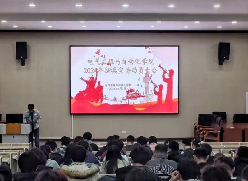 为深入学习贯彻习近平强军思想,进一步激发学生参军报国热情,营造良好的征兵工作氛围,4月7日晚,电气工程与自动化学院在艺术设计大楼报告厅举行2024年征兵动员大会。参与此次活动的老师有学院分管学生工作负责人、行政助理陈兮,辅导员黄新望、刘芳芳,各年级学生代表。本次活动还邀请到退役学生王浩燃进行征兵宣讲。