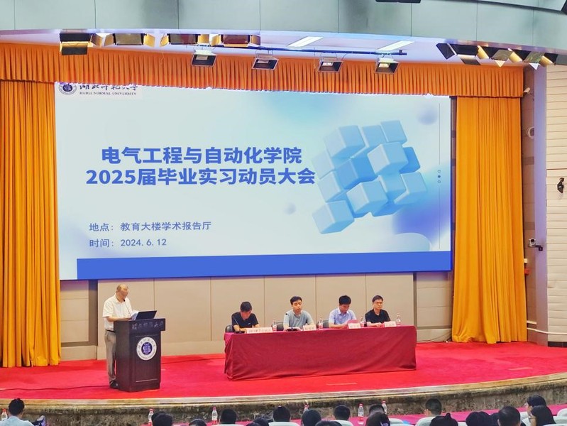 为提高学生对毕业实习的思想认识,扎实做好2025届毕业生专业实习工作,6月12日下午,电气工程与自动化学院在教育大楼报告厅召开2025届毕业实习动员大会。电气学院副院长杨青胜,自动化系主任阮焱林,学院教学办、学工办、实验教学中心负责人,实习工作日常负责人、实习指导教师、有关教学秘书和辅导员、2025届毕业班班主任及学生参加本次会议;实习企业代表东贝压缩机公司人力资源部门主管徐文进等应邀出席。本次会议由电气工程系主任涂建老师主持。