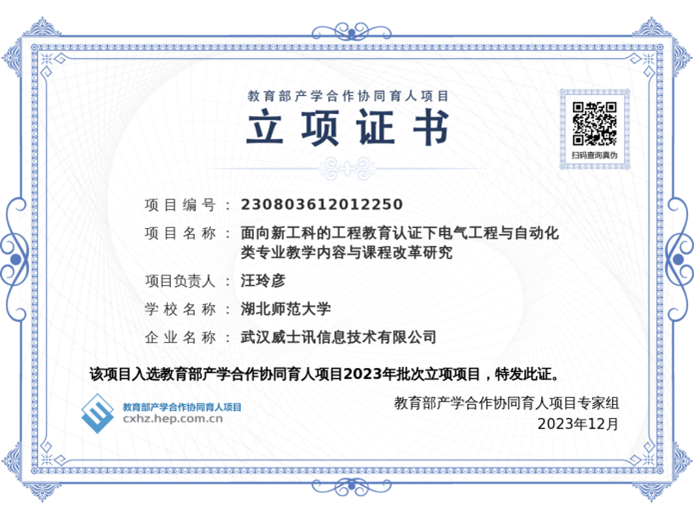 近日,教育部高等教育司公布了2023年批次教育部产学合作协同育人项目的评审结果,我院程伶俐老师主持的《通鹏科技虚拟仿真/VR仿真/MR仿真技术在教学内容和课程体系改革中的应用》、我院汪玲彦老师主持的《面向新工科的工程教育认证下电气工程与自动化类专业教学内容与课程改革研究》喜获教育部产学合作协同育人项目立项(项目编号:230710405507162230803612012250)。