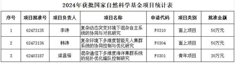 根据国家自然科学基金委《关于2024年国家自然科学基金集中接收申请项目评审结果的通告》(国科金发计〔2024〕165号),我院李涛教授申报的“复杂动态突变环境下混杂自主系统的协同与对抗研究”、韩涛教授申报的“复杂环境下多维度智能无人集群系统的协同控制与优化研究”成功获批面上项目,我院梁昌铎博士申报的“混杂通信下多维度海洋集群系统的拓扑优化编队控制研究”成功获批青年项目。
