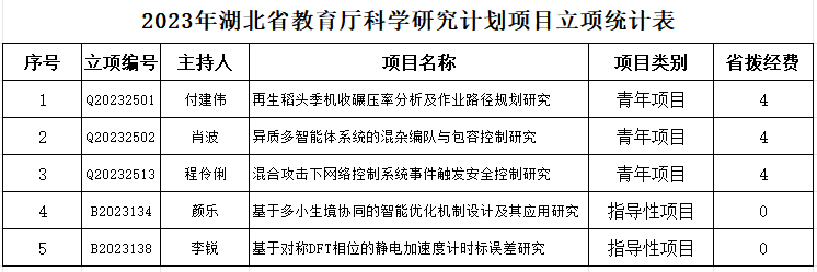 付建伟博士申报的项目“再生稻头季机收碾压率分析及作业路径规划研究”、肖波老师申报的项目“异质多智能体系统的混杂编队与包容控制研究”、程伶俐博士申报的项目“混合攻击下网络控制系统事件触发安全控制研究”获批青年项目,各获资助4万元;颜乐博士申报的项目“基于多小生境协同的智能优化机制设计及其应用研究”、李锐博士申报的项目“基于对称DFT相位的静电加速度计时标误差研究”获批指导性项目。