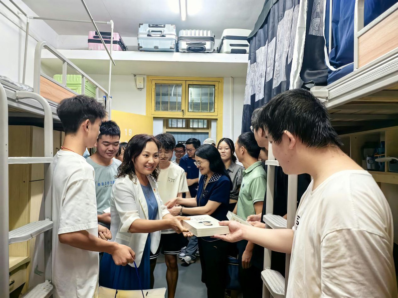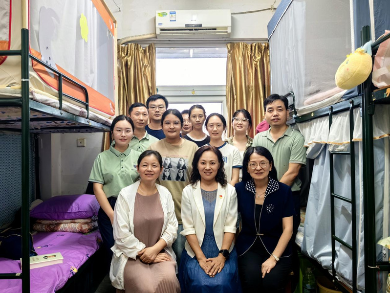 陆书记一行深入学生宿舍,与同学们亲切交谈,询问他们来自哪里、对新环境是否适应、入学手续办理得是否顺利,以及对新学期的期待和规划。走访过程中,她耐心地向新生介绍学院的专业特色、师资力量以及校园文化活动等情况,鼓励新生们保持积极向上的心态,珍惜校园时光,充分利用学校提供的资源,不断提升自我。
