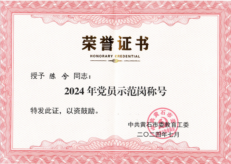 日前,中共黄石市委教育工委发文表彰2024年党员先锋岗,我院教师党支部书记陈兮博士荣获黄石市教育系统2024年党员示范岗称号。