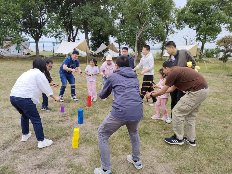 拓展活动主要由三个项目组成,第一个项目为“搭桥过河”,项目成员需凭借矫捷的身手和稳定的协调能力搭建积木度过一段“河流”,用时最短的团队获胜;第二个项目为“你投我接”,项目成员需互相配合,对成员的默契度和肢体的协调度要求很高,箱子中接入物品最多组获胜;第三个项目为“齐心协力搭积木”,团队成员需协助完成积木的拼搭,团队成员最短时间内完成积木拼搭获胜。