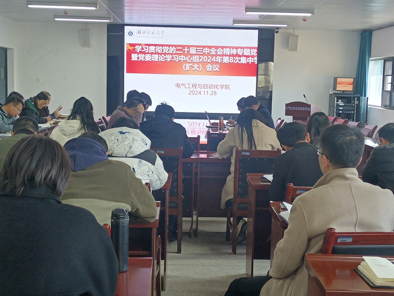 11月28日下午,电气工程与自动化学院举行学习贯彻党的二十届三中全会精神专题党课暨党委理论学习中心组2024年第八次集中学习(扩大)会。院党委书记丁桂兰以“学习贯彻全会精神 推动学院建设发展”为题面向全院教职工宣讲党的二十届三中全会精神。院长詹习生主持会议,全院教职工参加学习。