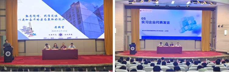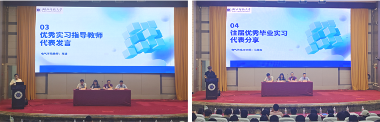 在经验分享环节,优秀实习指导教师代表肖波结合自身丰富的指导经验,从实习准备、过程管理、问题解决等方面为同学们提供了实用的建议,助力大家高效完成实习任务。往届优秀毕业实习代表、2108班马栋栋同学,生动地分享了自己在实习期间的成长故事与收获,用亲身经历激励学弟学妹们把握实习机会,勇于挑战自我。实习企业代表、湖北天华智能装备股份有限公司行政总监占志有从企业需求角度出发,介绍了企业对实习生的期待与培养模式,增进了同学们对实习岗位的了解。