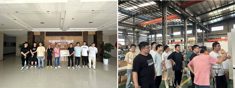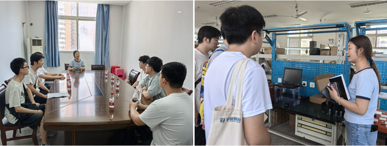 下午,6 名学生在付建伟老师和庞昭老师的共同带领下前往湖北天华智能装备有限公司。公司行政总监占总和生产部熊部长对同学们的到来表示热烈欢迎。占总详细介绍了公司的基本情况以及实习期间的注意事项,熊部长则深入讲解了公司产品及实习阶段的任务,并就实习基地建设达成共识。之后,占总带领大家参观了组装车间和测试台。最后,同学们还与已在该公司就业的上一届学长进行了亲切交流,学长们分享了工作经验和实习心得,让同学们对未来的实习和工作有了更清晰的认识。