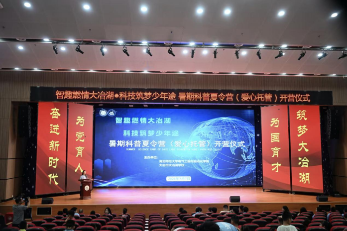 7月7日上午,湖北师范大学电气工程与自动化学院和湖北省大冶湖学校联合举办的科普夏令营(爱心托管班)活动,在大冶湖学校演艺厅举行开营仪式。湖北师范大学电气工程与自动化学院教师党员代表率36名大学生组成党员先锋服务队来到大冶湖学校,开展为期两周的以“智趣燃情大冶湖,科技筑梦少年途”为主题的科普夏令营(爱心托管班)活动。
