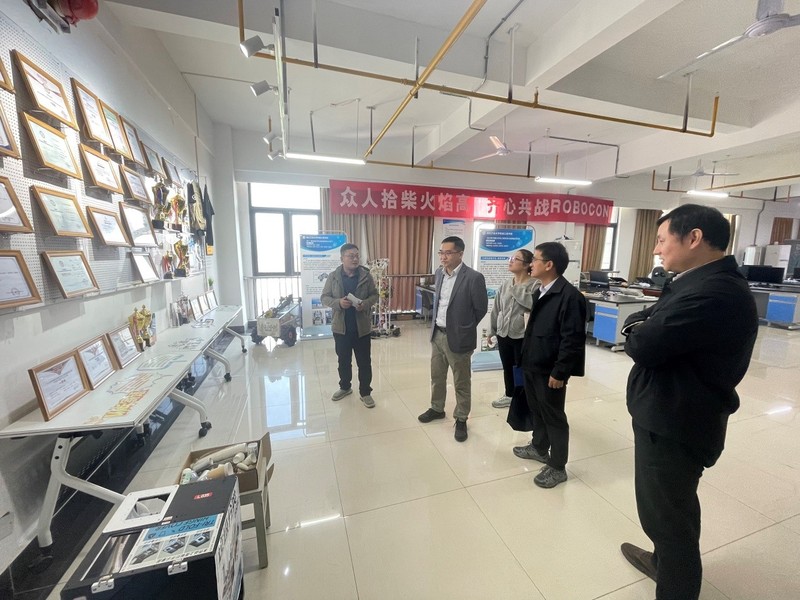 会后,调研组一行参观了工业机器人、智能制造系统、相关竞赛基地等专业实验实践平台,了解了设备配置情况与学生竞赛的管理与运行机制。实验室负责人现场讲解了多个代表性学生竞赛项目,具体展示了理论教学向工程实践转化的路径与方法。
