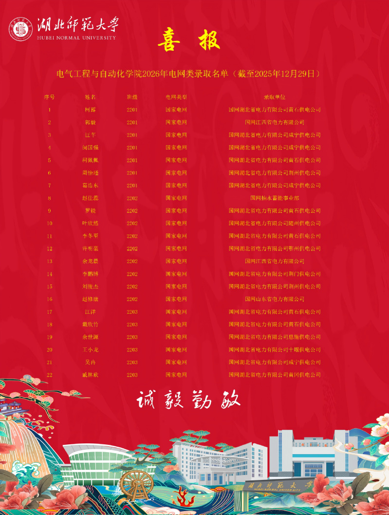 近日,随着国家电网各下属公司2026届高校毕业生考试招录结果陆续揭晓,电气工程与自动化学院毕业生在电网类国企招聘中再创辉煌。本次学院共有22名毕业生成功斩获电网类国企录用资格,其中18人签约国网湖北省电力有限公司,两类录用人数均刷新历史纪录,为学院毕业生高质量就业工作再添浓墨重彩的一笔,彰显出学院人才培养与就业工作的扎实成效。
